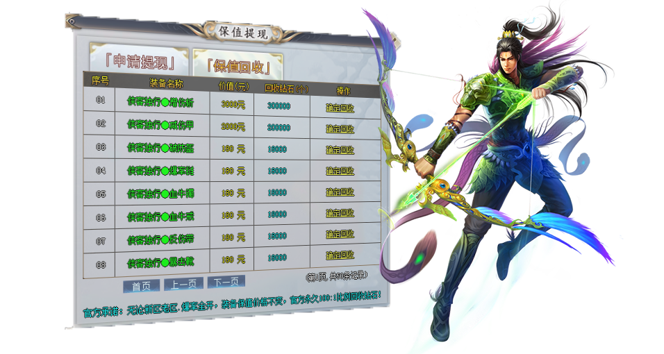 保值装备均永久单件回收现金,所有装备无合成,全靠游戏BOSS爆出,爆率永不关闭