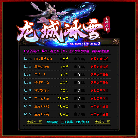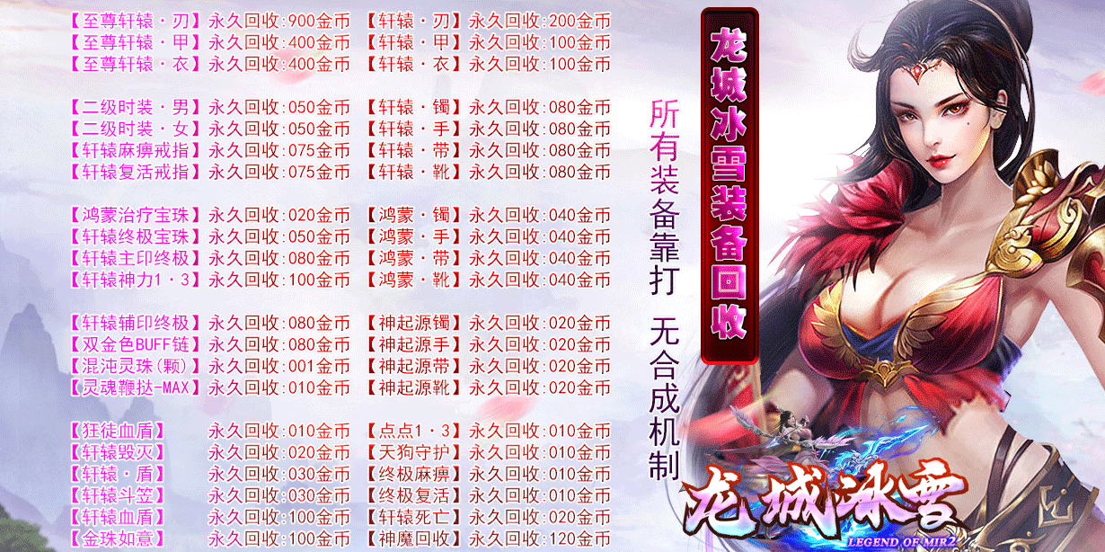 本服永久回收RMB装备百余件,具体请在游戏“永久回收”中查询,本服永久不关暴率!